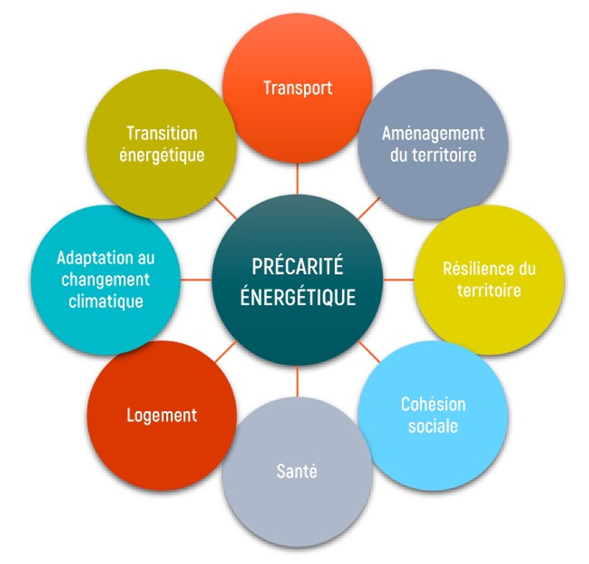 La précarité énergétique, qu’elle soit liée au logement ou aux déplacements, se situe au croisement d’enjeux environnementaux, sanitaires et socio-économiques. La lutte contre ce phénomène sollicite ainsi de nombreuses politiques sectorielles : action sociale, santé, logement, transition énergétique, transports, aménagement du territoire et urbanisme.