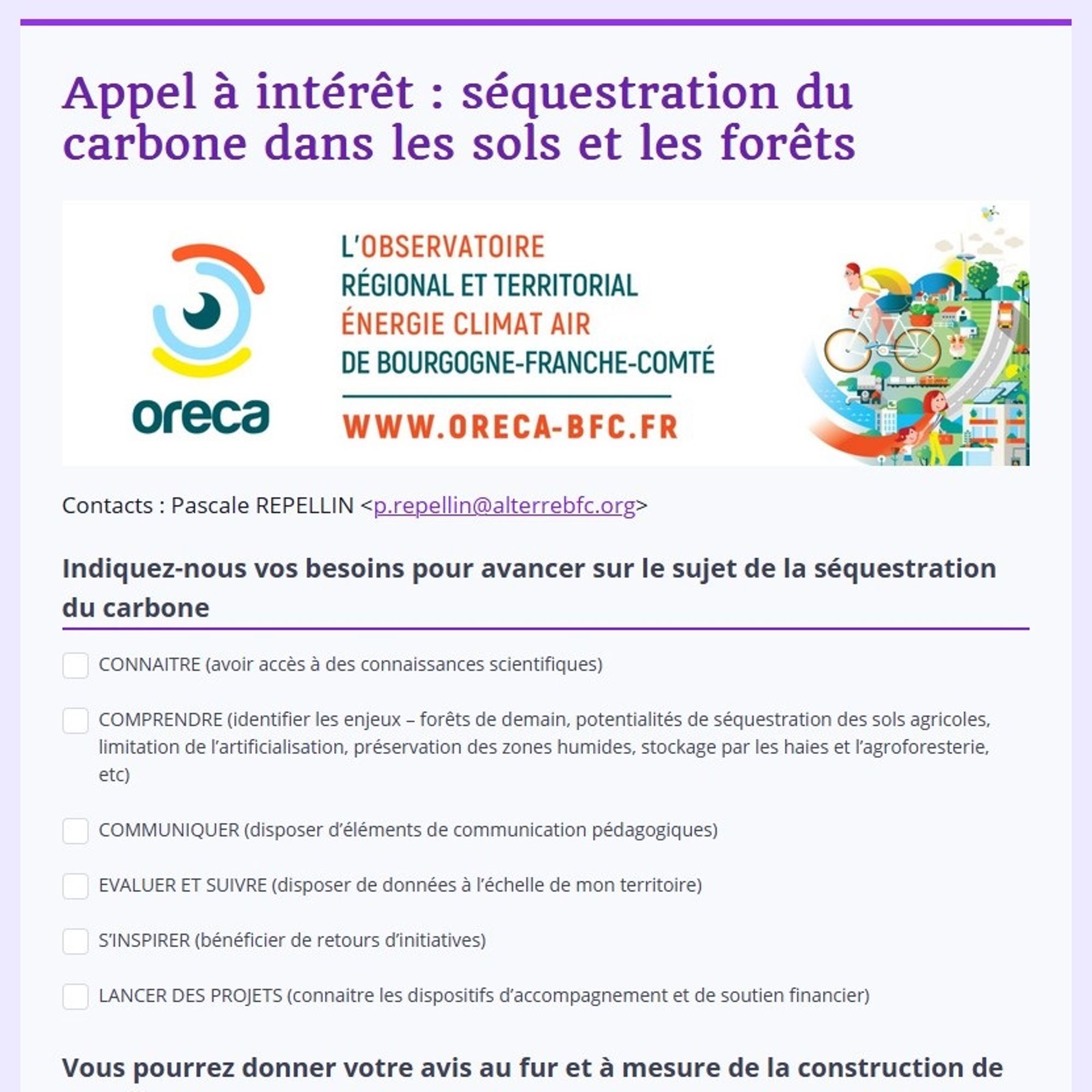 [Actu du 15 septembre 2023] L’ORECA vous sollicite en vue de construire un outil en ligne de capitalisation des connaissances et initiatives sur la séquestration du carbone et les enjeux qui y sont liés