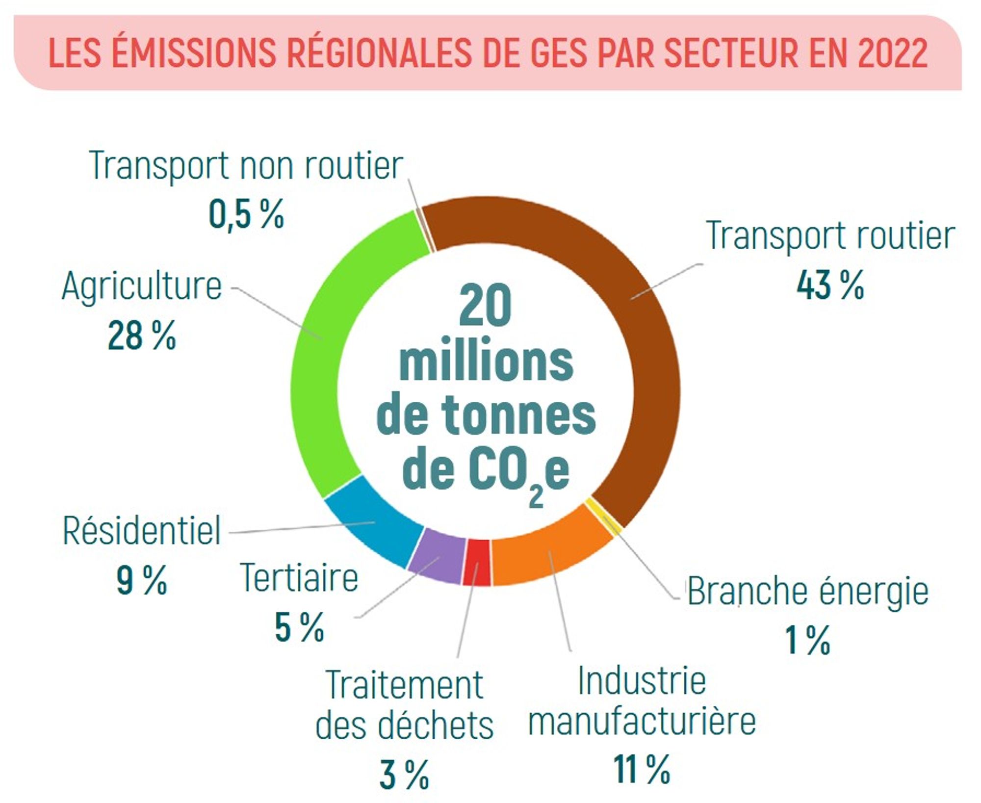 Les émissions liées à l’utilisation de l’énergie constituent la principale source de gaz à effet de serre. Le transport routier en représente la part la plus importante, avec 43 % des émissions régionales, loin devant les bâtiments résidentiels et tertiaires (14 %) et l’industrie (11 %).