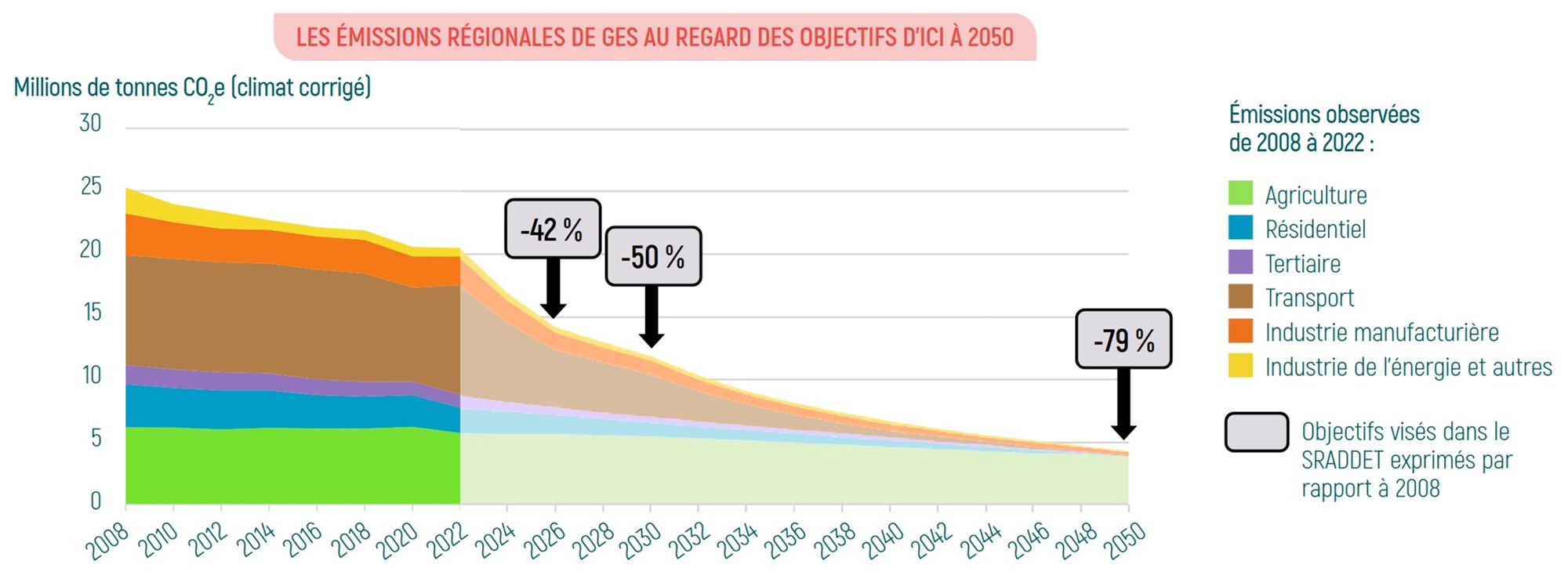 Après la crise sanitaire, les bâtiments et l’industrie ont poursuivi leur baisse, tandis que les transports ont retrouvé en 2022 un niveau d’émissions supérieur à celui d’avant-Covid. Sur la période, les émissions régionales ont diminué de 19 % (corrigé des variations climatiques), alors qu’une réduction de 30 % était nécessaire pour atteindre l’objectif de 2021. Ce rythme encore trop lent devra s’accélérer pour permettre d’atteindre les objectifs 2030 (-50 %) et 2050 (division par cinq).