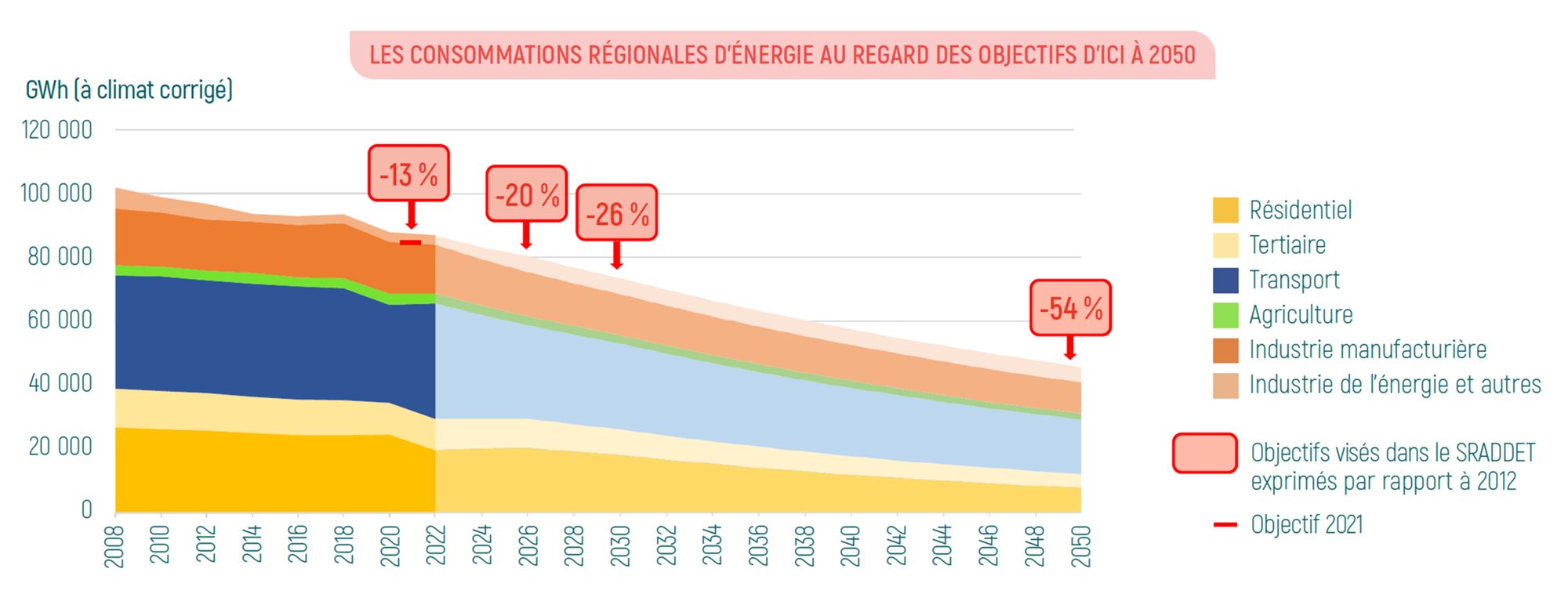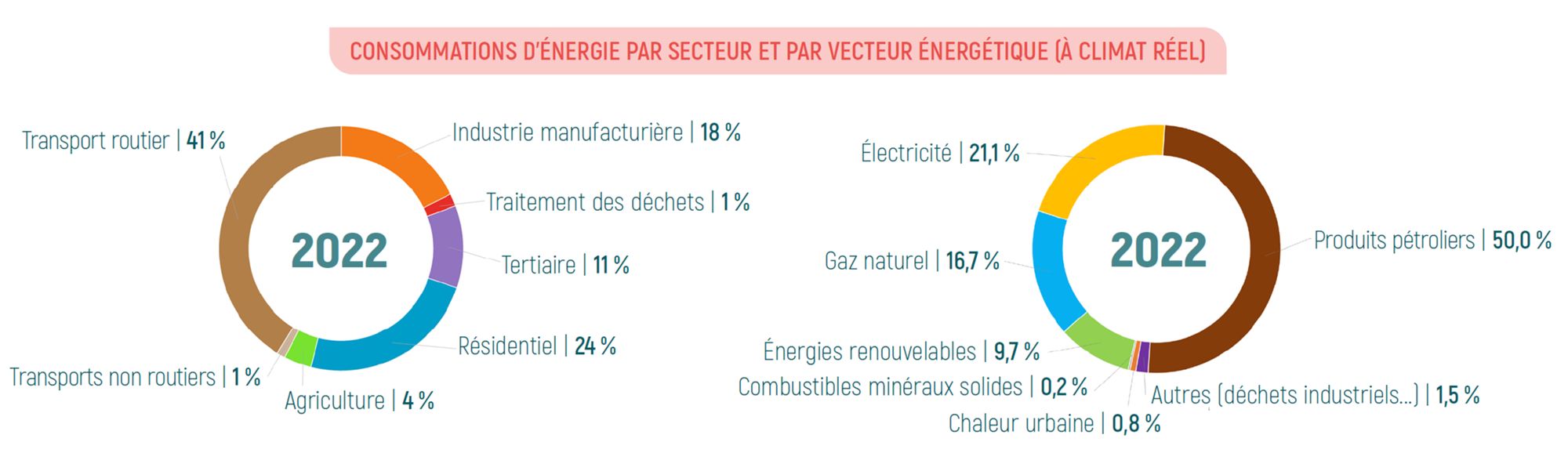 Il s’agit ici des consommations finales d’énergie sur le territoire, c’est-à-dire l’énergie consommée par les utilisateurs finals - ménages, transports (voyageurs et marchandises), industrie, secteur tertiaire et agriculture. Il ne comptabilise pas les consommations liées à la transformation, au stockage ou à la distribution d’énergie par les producteurs d’énergie (ex : production de chaleur pour les réseaux de chauffage urbain), ni les usages d’énergies en tant que matière première (ex : pétrochimie).