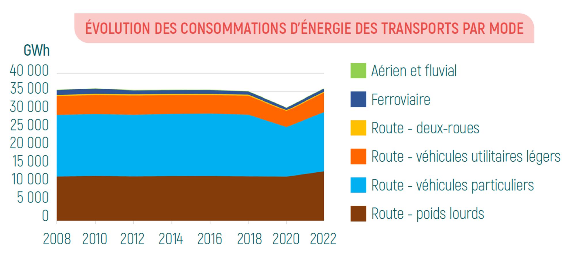 La route concentre 97 % de la consommation d’énergie des transports, une part en progression, alors que le ferroviaire recule de 3,6 % en 2008 à 2,3 % en 2022.