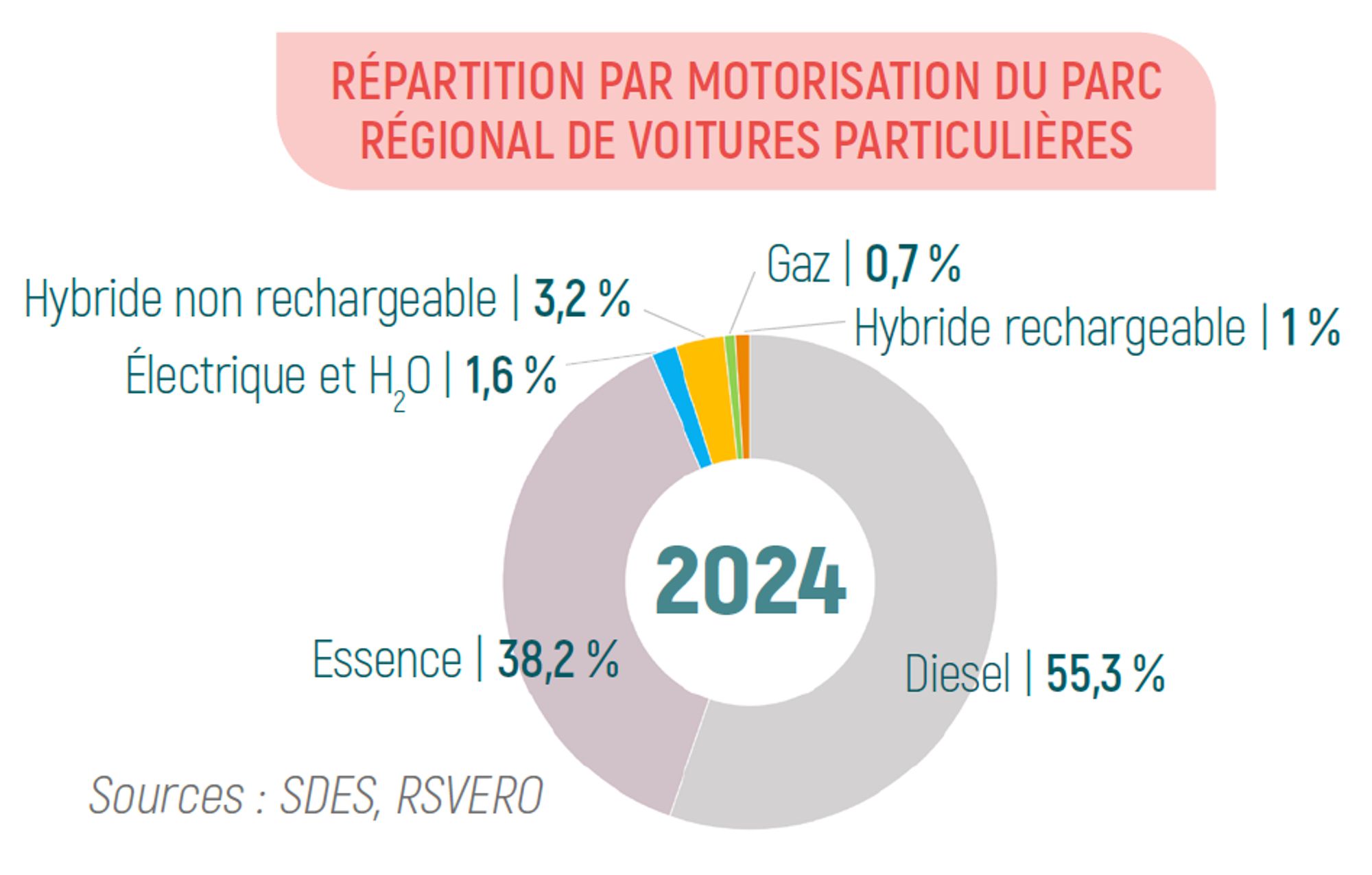 La part du diesel recule (55 % des voitures particulières en 2024 contre 66 % en 2015), au profit de l’essence (38 %).