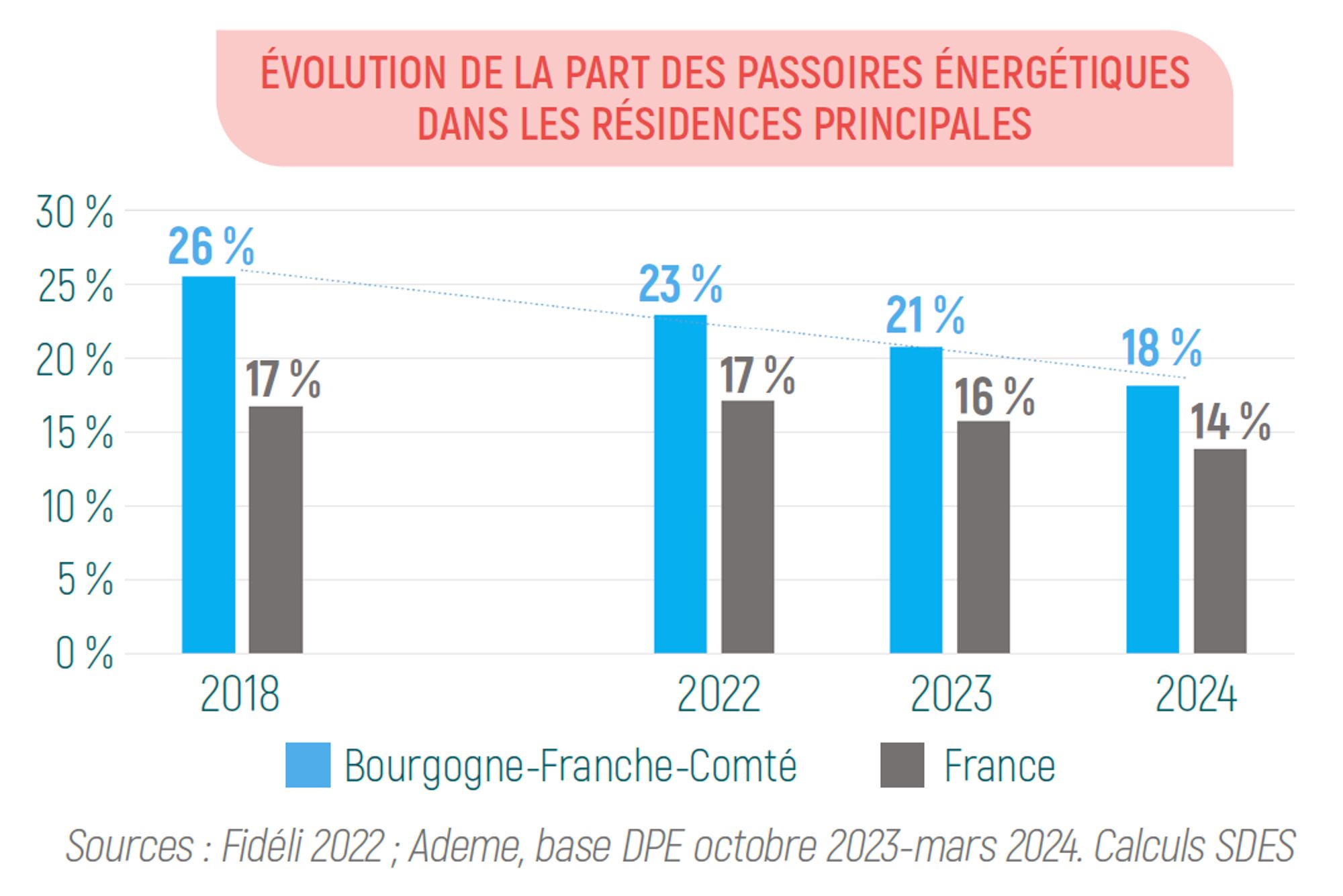 Même si la Bourgogne-Franche-Comté compte encore une proportion de logements énergivores (étiquettes F et G) supérieure à la moyenne nationale, celle-ci a nettement diminué, passant de 26 % en 2018 à 18 % en 2024. Des efforts importants restent toutefois à faire car, en intégrant les logements classés E, ce sont 42,2 % des résidences principales potentiellement concernées par des restrictions de location d’ici 2034. À l’opposé, seuls 4,9 % des logements sont classés A ou B, contre 7,2 % en Métropole.