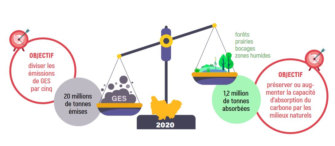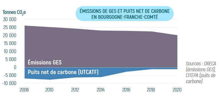 En Bourgogne-Franche-Comté, les activités sur le territoire régional ont émis l’équivalent de 20 millions de tonnes de CO2 en 2020, alors que les forêts et sols ont absorbé, la même année, de l’ordre de 1,2 million de tonnes de CO2. Le puits net de carbone a ainsi compensé à peine 6 % des émissions de GES, l’objectif étant d’atteindre 100 % en 2050.